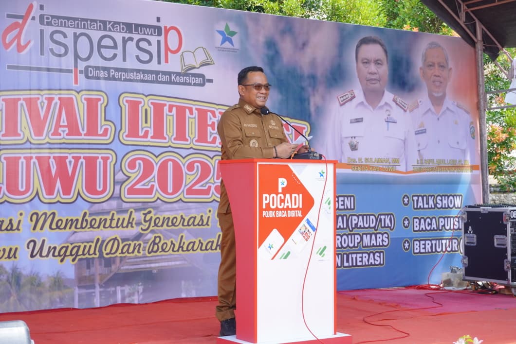 LUWU—Bupati Luwu, Patahudding, membuka Festival Literasi Luwu 2025 yang mengusung tema “Literasi Membentuk Generasi Muda Luwu Unggul dan Berkarakter” di pelataran Gedung Perpustakaan Kabupaten Luwu, Senin (27/10/2025).