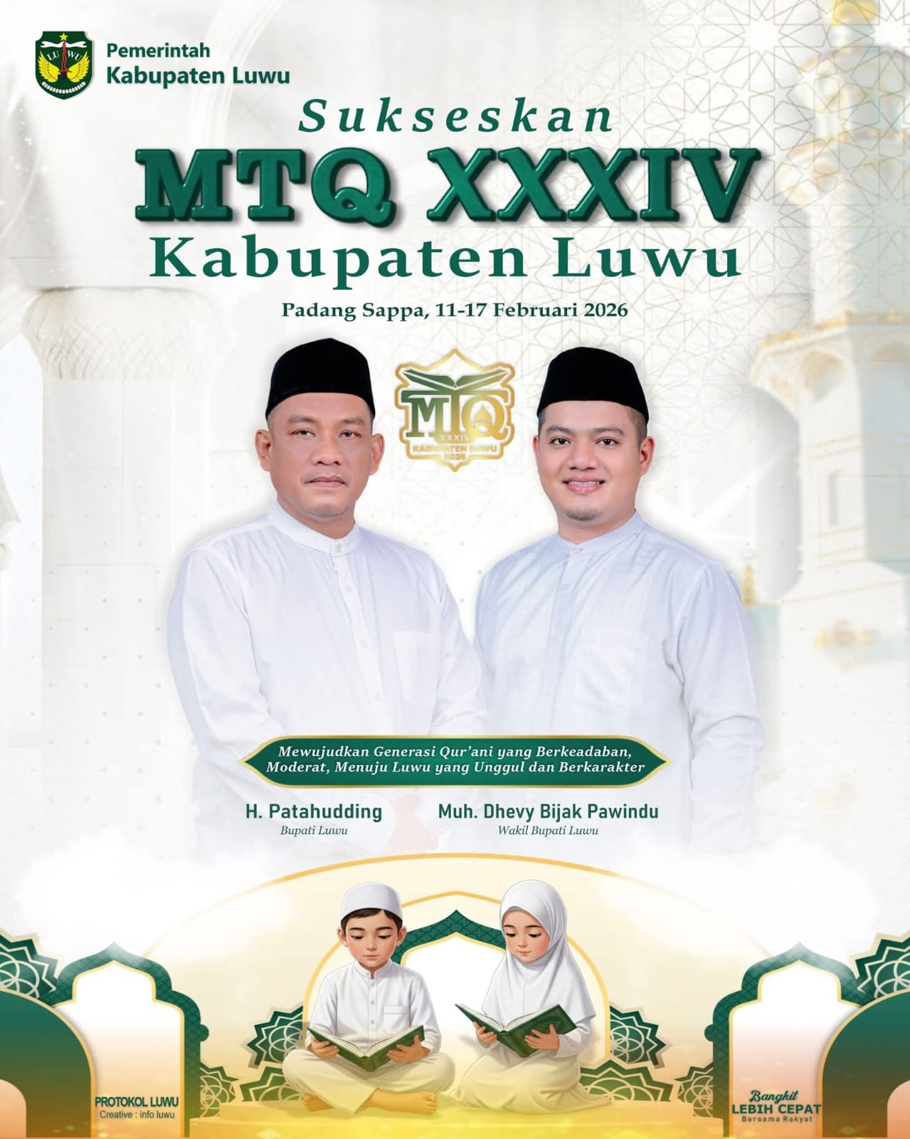 LUWU — Musabaqah Tilawatil Qur’an (MTQ) ke-XXXIV Tingkat Kabupaten Luwu Tahun 2026 resmi mengangkat tema “Mewujudkan Generasi Qur’ani yang Berkeadaban dan Moderat Menuju Luwu yang Unggul dan Berkarakter.” Tema tersebut menegaskan komitmen pemerintah daerah dalam membina serta memperkuat pengamalan nilai-nilai Al-Qur’an di tengah masyarakat.