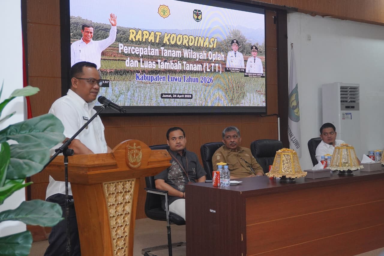 LUWU — Bupati Luwu, Patahudding, menekankan pentingnya penguatan peran penyuluh saat Rapat Koordinasi Percepatan Tanam Wilayah Optimalisasi Lahan (Oplah) dan Luas Tambah Tanam (LTT) di Aula Rumah Jabatan Bupati Luwu, Jumat (24/4/2026).